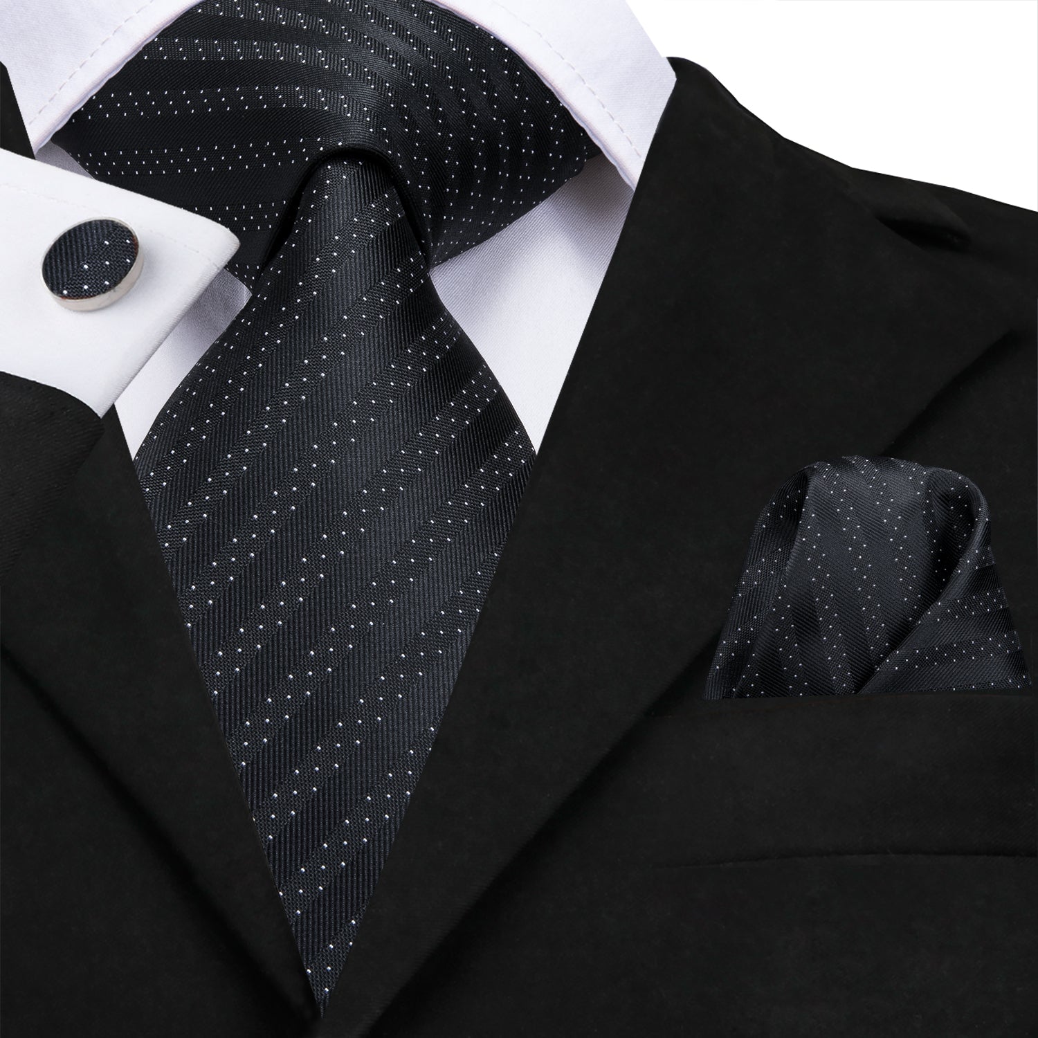 Black Polka Dot Striped Mens's Tie Pocket Square Cufflinks Set