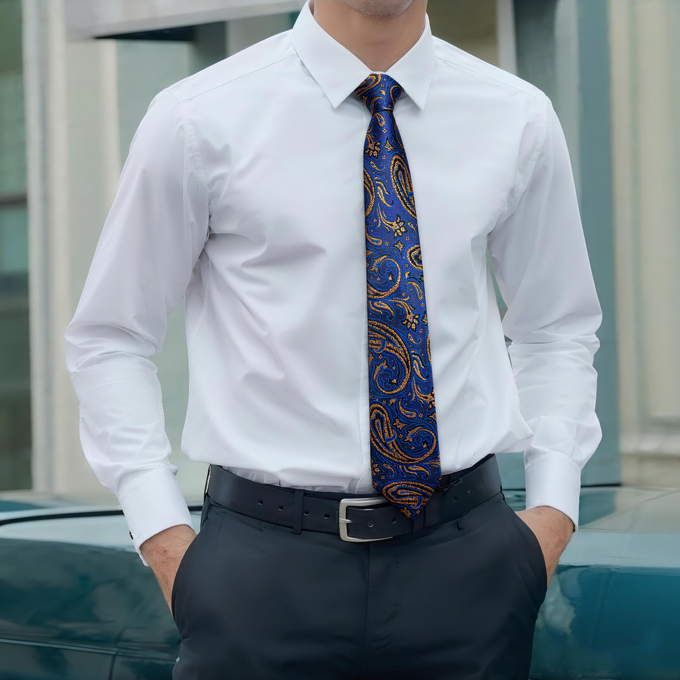 Mens Blue Tie Silk Paisley Necktie Pocket Square Cufflinks Set
