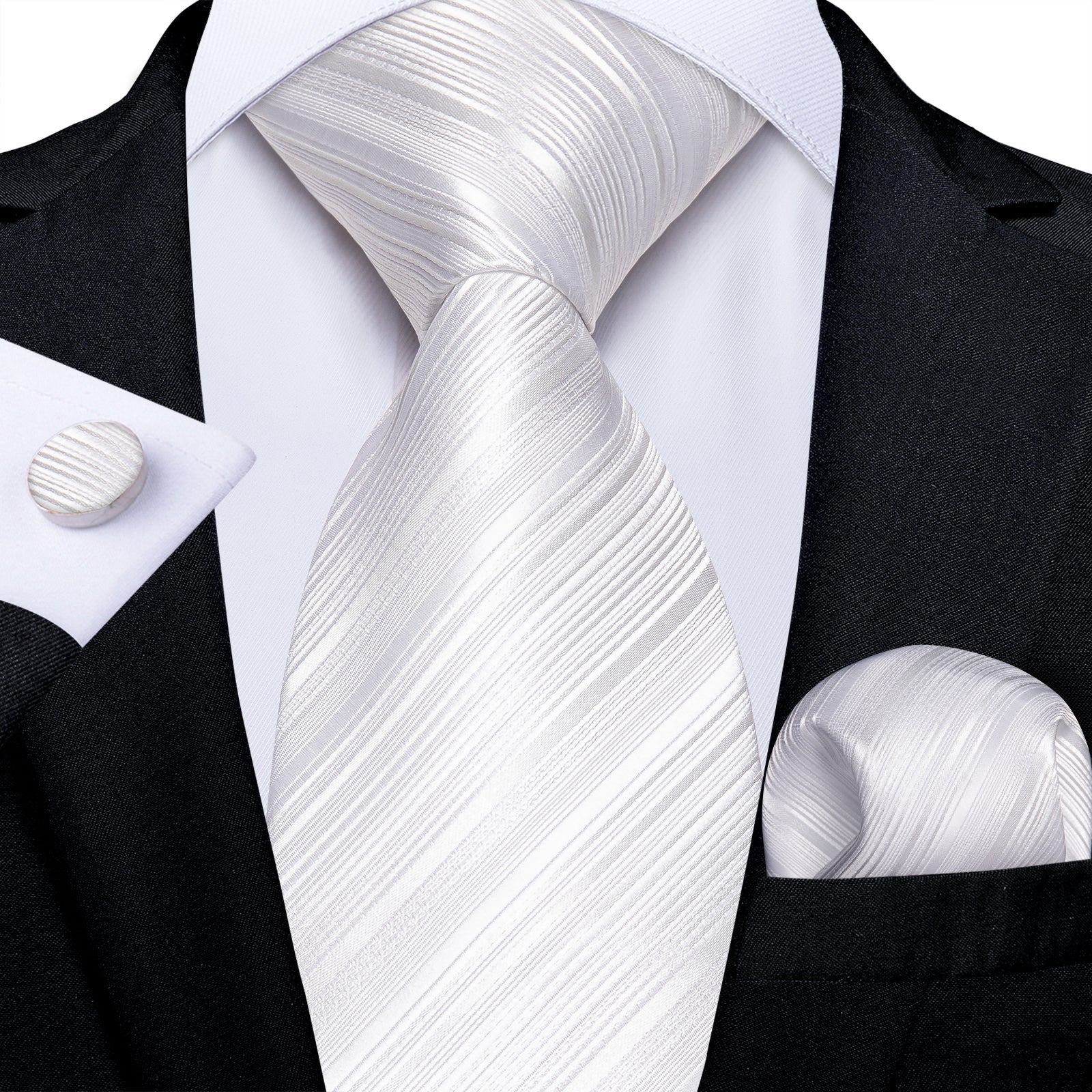 Striped Tie for Men White Silk Tuxedo Necktie Handkercheif Cufflinks Set